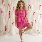 Блуза з делікатними зав’язками та легким об’ємом виглядає витончено й сучасно, створюючи «дорослий» силует у дитячому гардеробі.