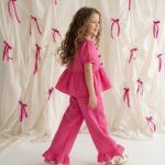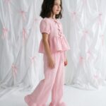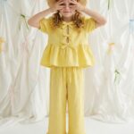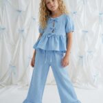 Блуза з ніжними зав’язками та делікатним об’ємом виглядає легко й естетично, додаючи образу витонченості. Штани-палаццо з рюшами по низу створюють красивий рух у кожному кроці та формують стильний, сучасний силует.