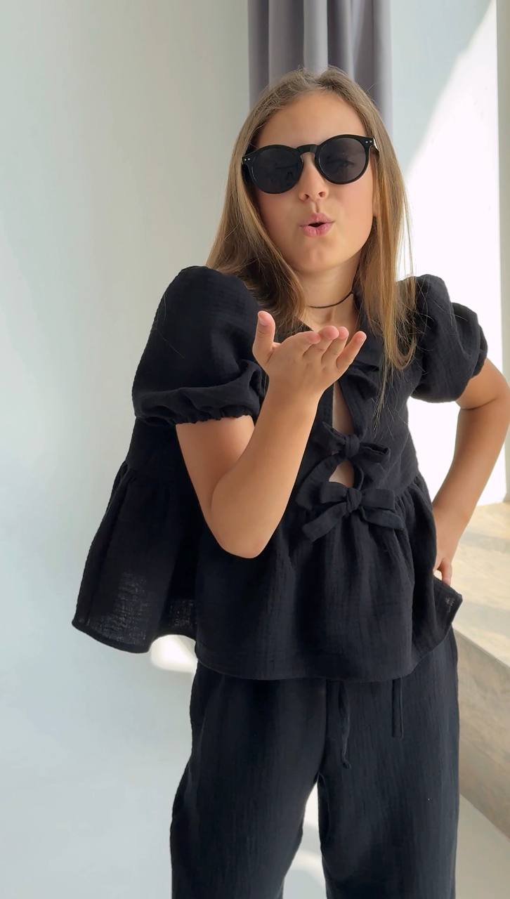 Глибокий чорний колір додає образу «дорослого» настрою та робить комплект універсальним – для прогулянок, подорожей чи навіть особливих подій.