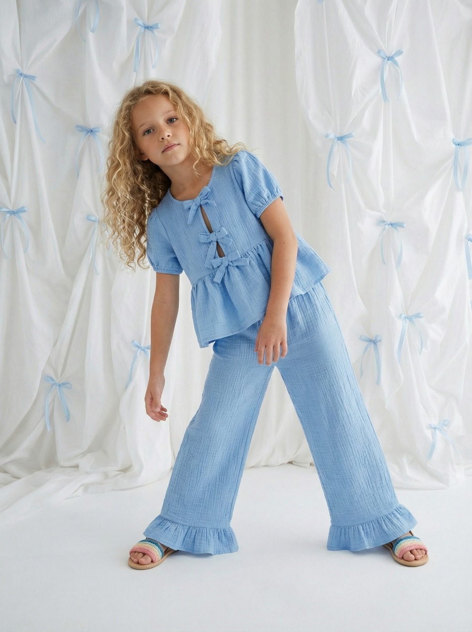 Блуза з ніжними зав’язками та делікатним об’ємом виглядає легко й естетично, додаючи образу витонченості. Штани-палаццо з рюшами по низу створюють красивий рух у кожному кроці та формують стильний, сучасний силует.