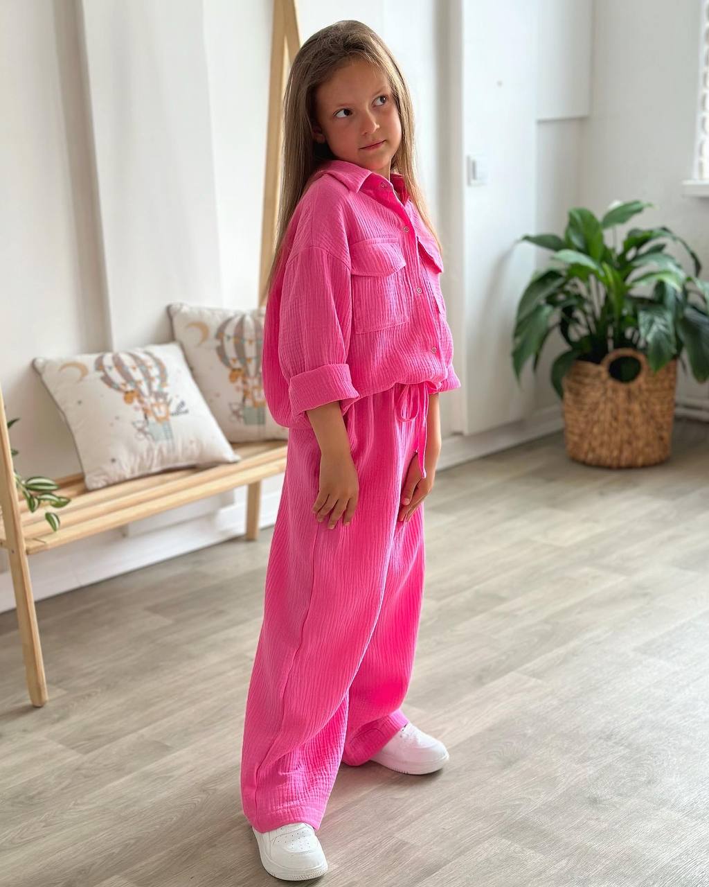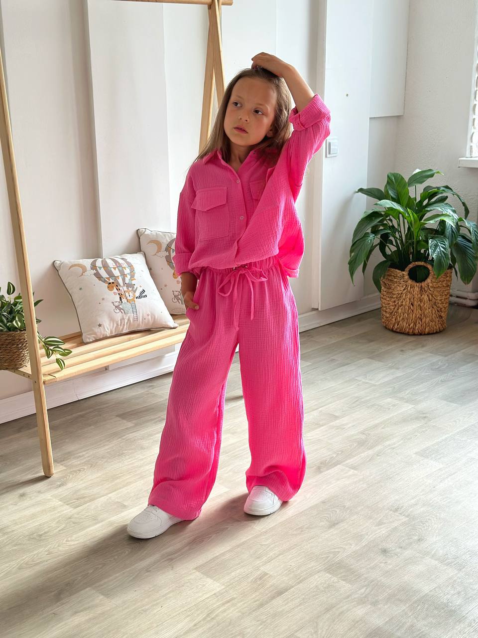 Сорочка вільного крою додає образу невимушеності та легко комбінується як у комплекті, так і окремо. Штани-палаццо з м’якою посадкою красиво рухаються під час ходьби, створюючи стильний силует.