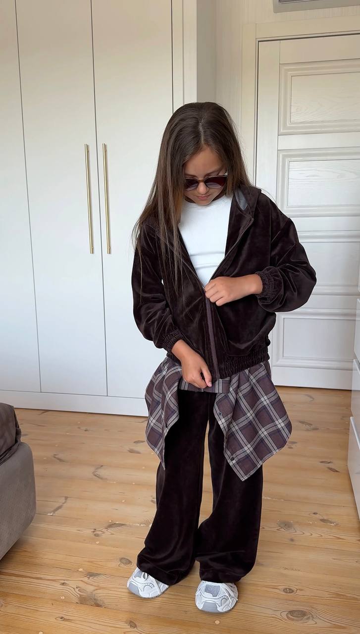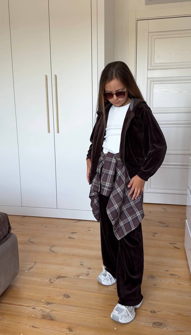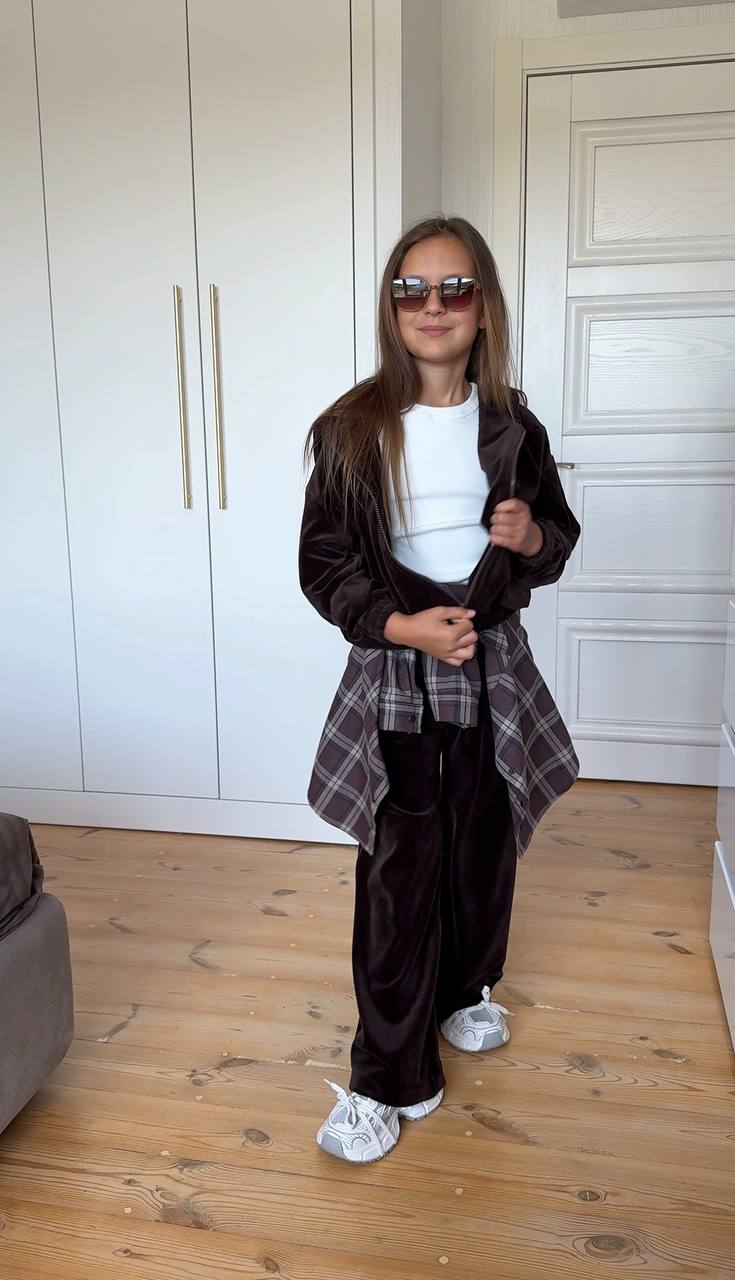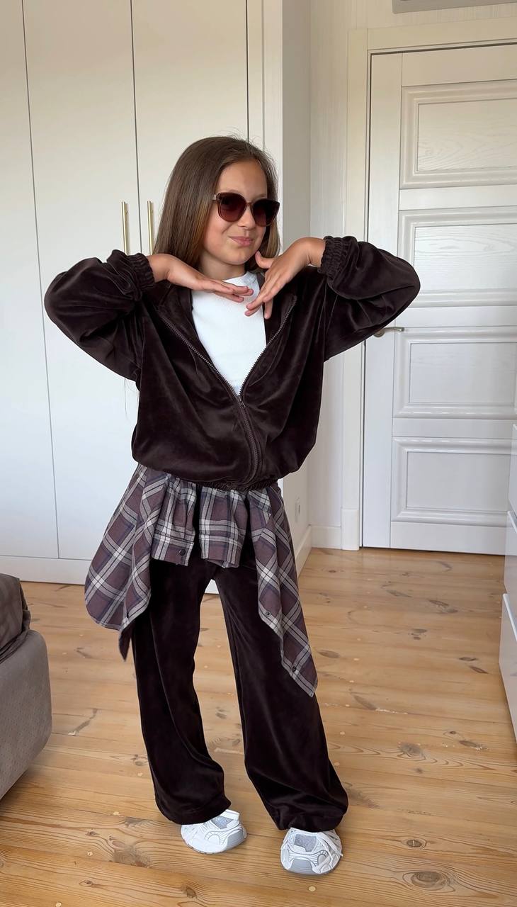 Шоколадний відтінок додає образу стилю, а м’яка фактура велюру робить костюм особливо затишним. Ідеальний варіант для прогулянок, подорожей або щоденних образів, коли хочеться поєднати комфорт і стиль.